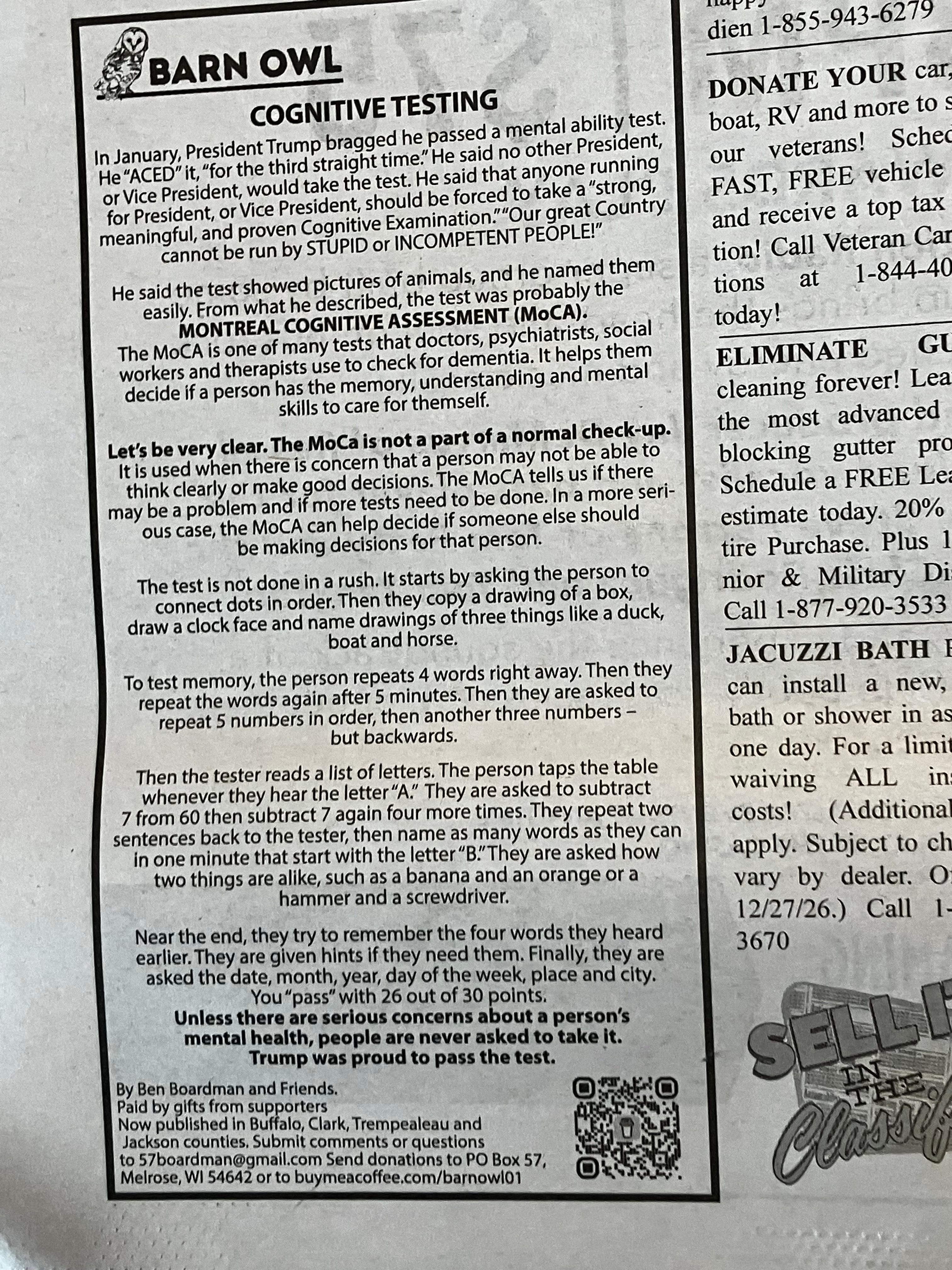 BARN OWL has posted in rural county papers and shoppers as a paid ad for the last year. County papers are still accessible outside of corporate media and they reach all levels of the community. In Jackson, Clark and Trempealeau counties in Wisconsin, BARN OWL arrives on every kitchen table in the Shopper or the county paper of record. It may not always be read - but it is now part of the conversation. In close communities, people keep their opinions to themselves. BARN OWL allows you to read with privacy. One lady at our local quick stop said she buys the paper “for BARN OWL and the obituaries.”