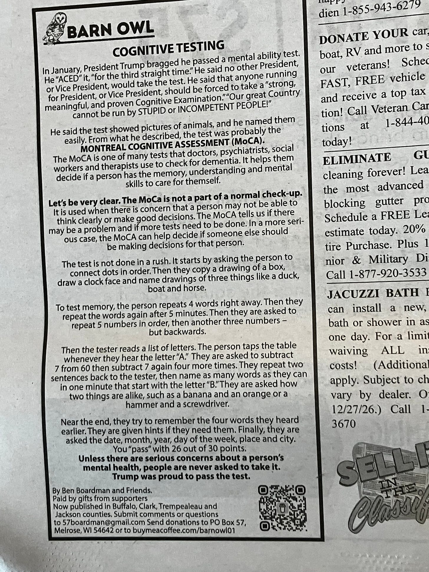 I have used the Montreal Cognitive Assessment (MoCA) more often than I care to remember. I may know it by heart. It is rarely used on cognitively healthy people. It is apparent within moments how well a person will respond to the questions on the test. Some simply fail. Others may have built layers of defense against such inquiries, telling you that they just don’t pay attention to the date or time anymore, or they refuse to test at all, get ornery and indignant. All are significant signs. Apparently the POTUS has passed the test at least three times he says.