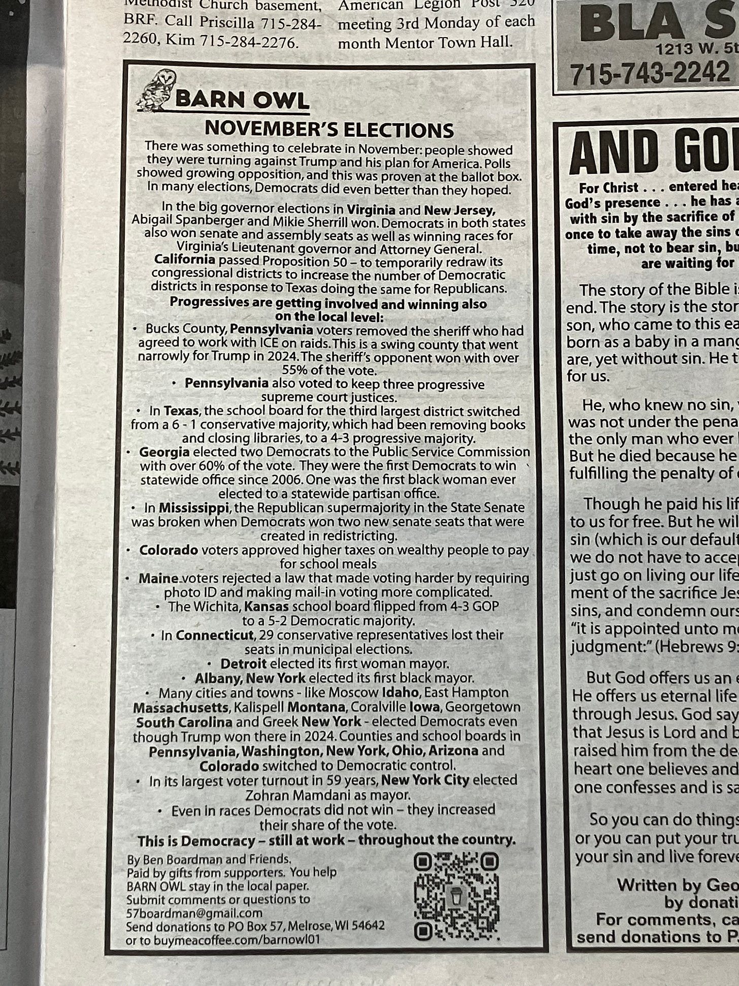 I see Barn Owl as an action of the “long game” of left wing politics that has been lost to us for generations. These articles are available to any one who wants to publish them in their own rural community. BUT if you can’t afford 6 inches and you live where you have a county paper or a shopper, pay for something short that you can afford and can appear weekly. Even a few lines well written and honest in the body of a small paper or in the want ads will draw some attention and remind the reader that something is going on that matters.