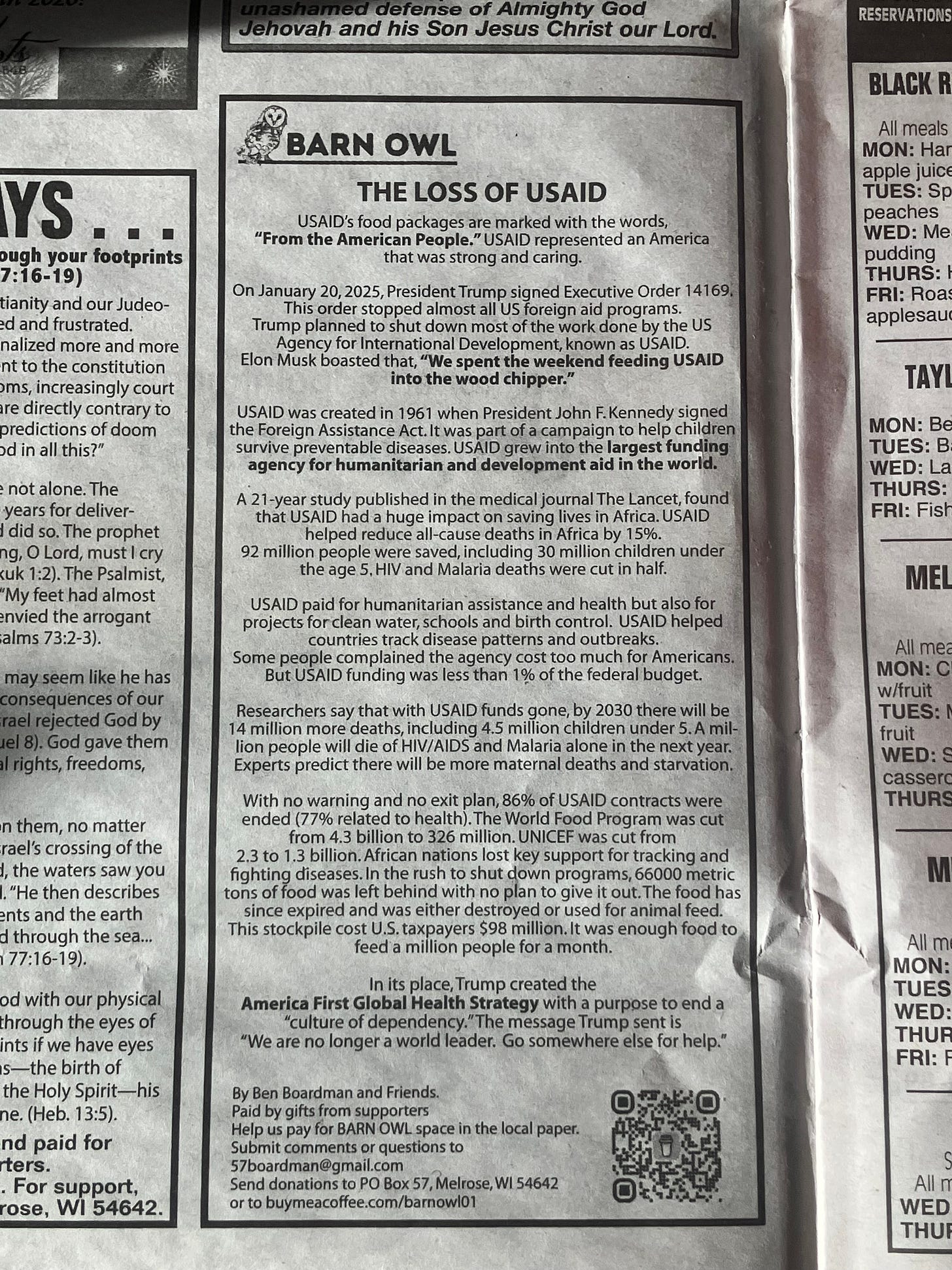 Kudos for a reminder that we are judged by our deeds as a nation, just as we are as individuals. Our values are clearly stated by where we invest our resources of effort, time, tangible goods and money. By this measure, Trump, Musk and his power ilk, as well as those who through some combination of malice, apathy or ignorance, are to be condemned. USAID and the Peace Corps were statements of empathy, commitment to everyone’s human dignity and noble generosity. Only a pseudo-Christian or sadist can stand idly by while he kills millions with the stroke of a pen or an edict over X. By contrast this is not what the vast majority of American people are, but we must show and shout and then eliminate that yawning gap between our people and those we have erred in choosing for positions of power. 26 is coming, and was man does, man can undo.